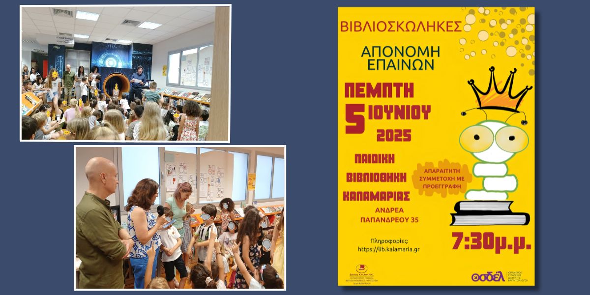 Η εβδομάδα ολοκληρώθηκε με την Εκδήλωση Απονομής των Επαίνων για τα παιδιά που συμμετείχαν ατομικά στο πρόγραμμα, καθώς και για τα παιδιά των σχολείων που επιλέχθηκαν μέσω κλήρωσης, λόγω του ιδιαίτερα αυξημένου ενδιαφέροντος. Τιμητικές βραβεύσεις απένειμε ο Αντιδήμαρχος Παιδείας, Δια Βίου Μάθησης και Πολιτισμού του Δήμου Καλαμαριάς, Αθανάσιος Γιαννακός, ο οποίος συνεχάρη θερμά τους μικρούς αναγνώστες για τη συμμετοχή και την αγάπη τους για τα βιβλία. Στην εκδήλωση, τα παιδιά εντυπωσίασαν με τις εύστοχες και ώριμες απαντήσεις τους σχετικά με τη σημασία της ανάγνωσης, αποδεικνύοντας την ουσιαστική επίδραση του προγράμματος. Το παρών έδωσαν, μέσω βιντεοσκοπημένων συνεντεύξεων, ο Γιωργανδρέας Ζάννος, διευθυντής του ΟΣΔΕΛ και ο Βαγγέλης Ηλιόπουλος, ο πιο πολυδιαβασμένος Έλληνας συγγραφέας του προγράμματος «Βιβλιοσκώληκες 2024-2025».