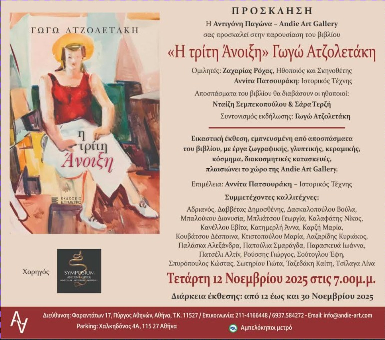 Την Τετάρτη 12 Νοεμβρίου 2025, στις 7.00μ.μ., στην Andie Art Galler (Φαραντάτων 17, Αθήνα) παρουσιάζεται το βιβλίο «Η τρίτη Άνοιξη» της Γωγώς Ατζολετάκη.