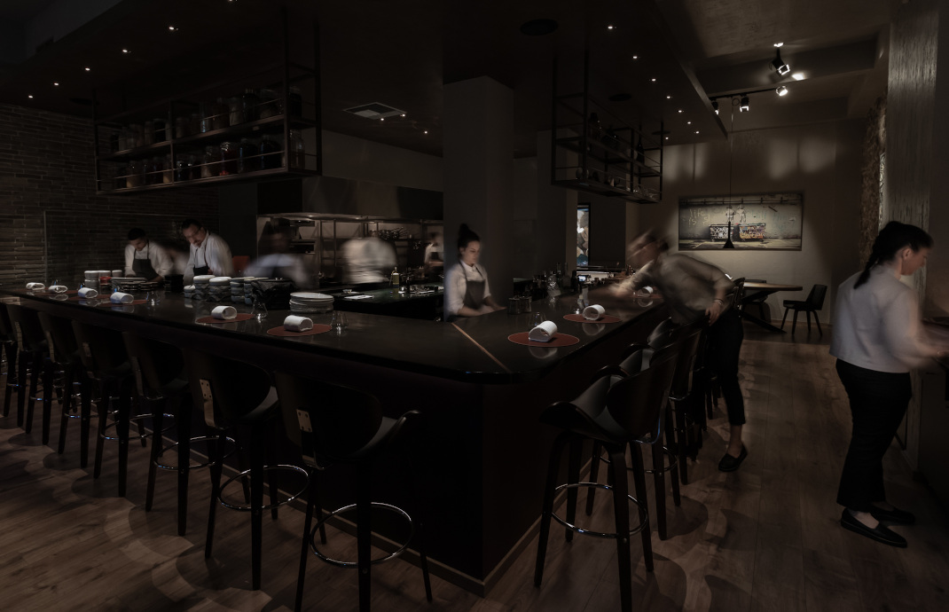 Να ξέρετε όμως ότι για να επισκεφτείτε το «Herve» πρέπει οπωσδήποτε να έχετε κάνει κράτηση -θα πληκτρολογήσετε μάλιστα τον κωδικό στην είσοδο- μιας και θέλουν να αποφεύγουν τον συνωστισμό. Μόλις περάσετε την πόρτα του, σε αντίθεση με αυτό που πιστεύετε για ένα εστιατόριο fine dining, θα βρεθείτε σε έναν χώρο λιτό με urban στοιχεία, χωρίς φιοριτούρες και υπερβολές. Αναπαυτικά σκαμπό και πολυθρόνες, αλλά και μια τεράστια μπάρα, βρίσκονται περιμετρικά της ανοιχτής κουζίνας, από όπου μπορείτε να παρακολουθήσετε τη διαδικασία παρασκευής του γεύματός σας, ενώ το μοντέρνο τούβλο και τα γκράφιτι στους τοίχους δημιουργούν μια χαλαρή και άνετη ατμόσφαιρα.