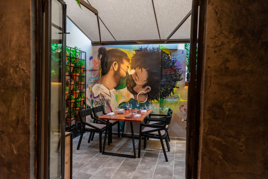 Τριγύρω, θα βρείτε ελάχιστα τραπέζια, ενώ υπάρχει και μια μικρή αυλή με κάθετους κήπους που εμπνέεται από την αρχιτεκτονική του Patrick Blanc, στην οποία ξεχωρίζει το εντυπωσιακό γκράφιτι του γνωστού καλλιτέχνη #Misterachilles.