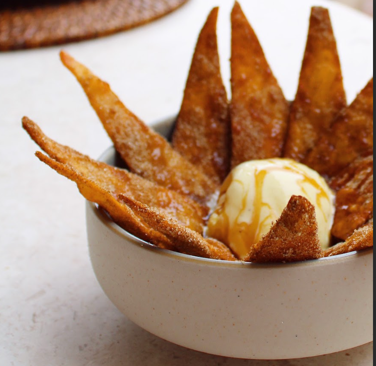 Για ένα γλυκό φινάλε μην παραλείψετε να δοκιμάσετε τα τραγανά πιτάκια Sopaipilla με κανέλα Κεϋλάνης, σιρόπι αγαύης, μέλι και παγωτό βανίλια πασπαλισμένα με Επτανησιακές μάντολες.
