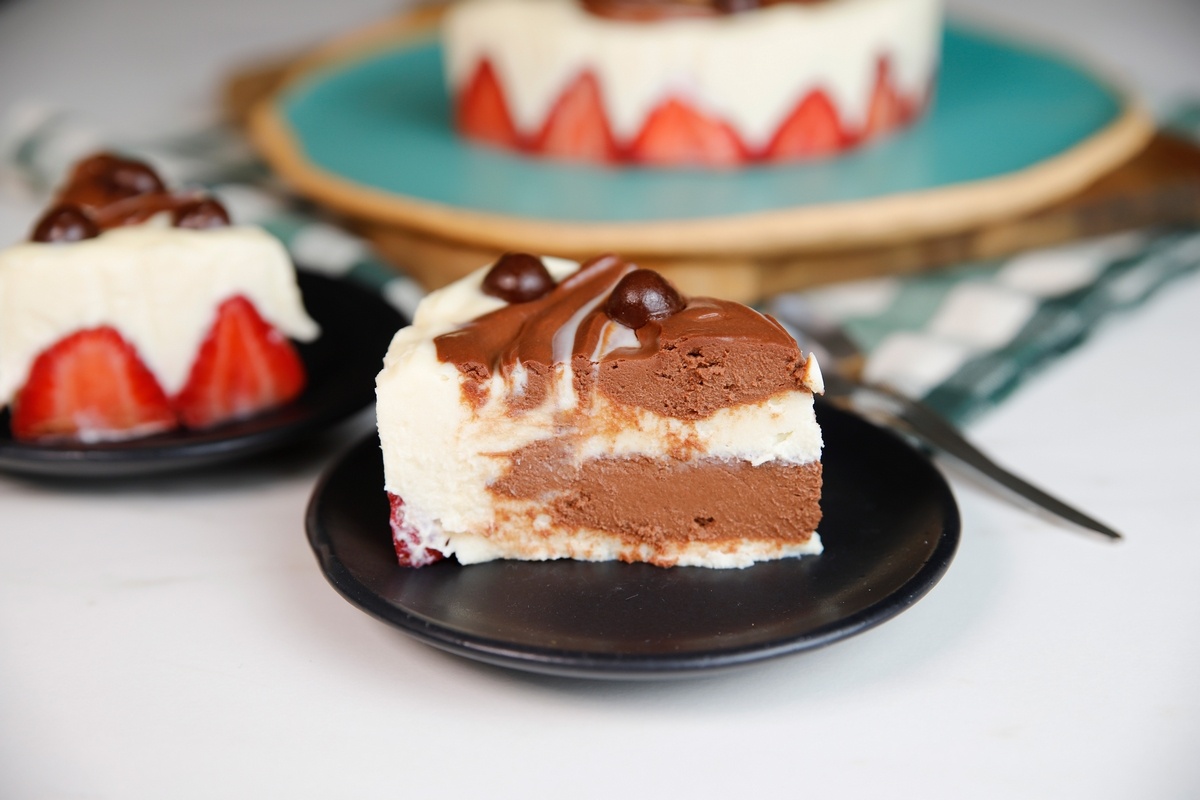 Η βάση από στραγγιστό γιαούρτι προσθέτει πρωτεΐνη και κρεμώδη υφή, ενώ ο συνδυασμός μαύρης και λευκής κουβερτούρας προσφέρει πλούσια σοκολατένια γεύση χωρίς περιττές υπερβολές. Ιδανική για ένα πιο «ελαφρύ» γλυκό μετά το φαγητό ή για μια ιδιαίτερη περίσταση με άρωμα άνοιξης.