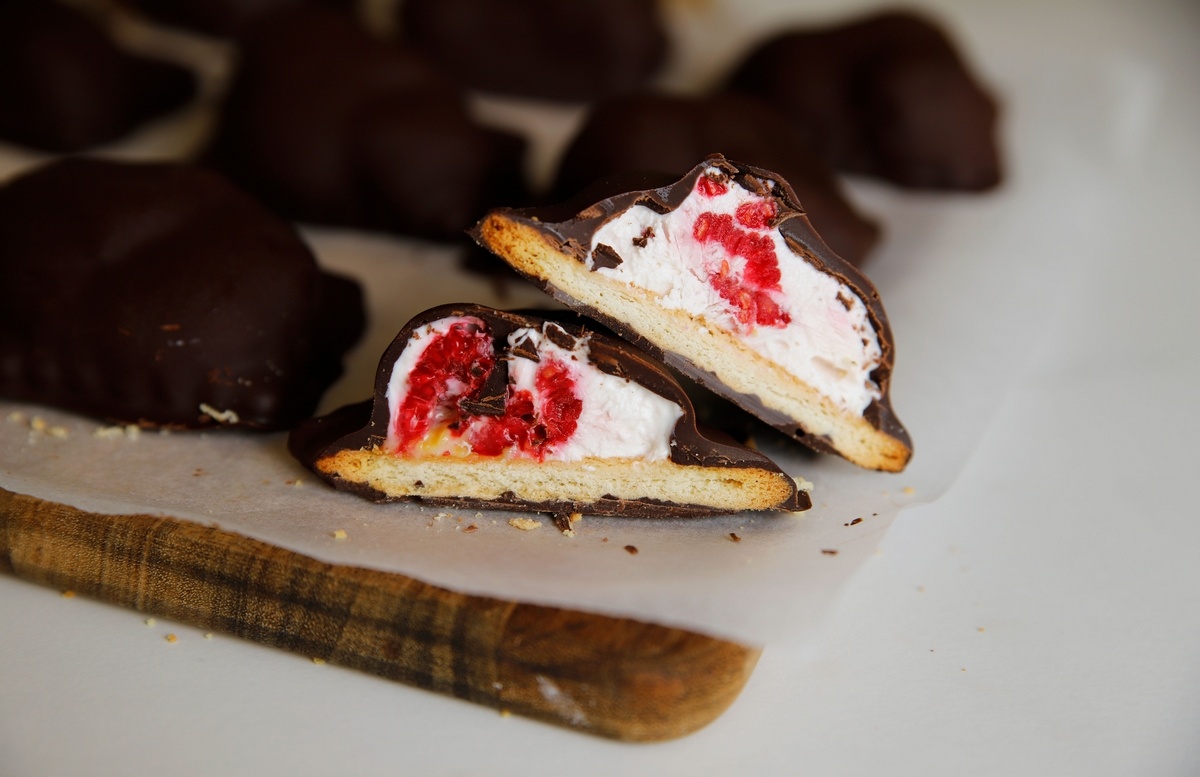 - Τοποθετούμε τα γεμισμένα μπισκότα σε δίσκο και τα αφήνουμε στην κατάψυξη μέχρι να παγώσουν καλά.
