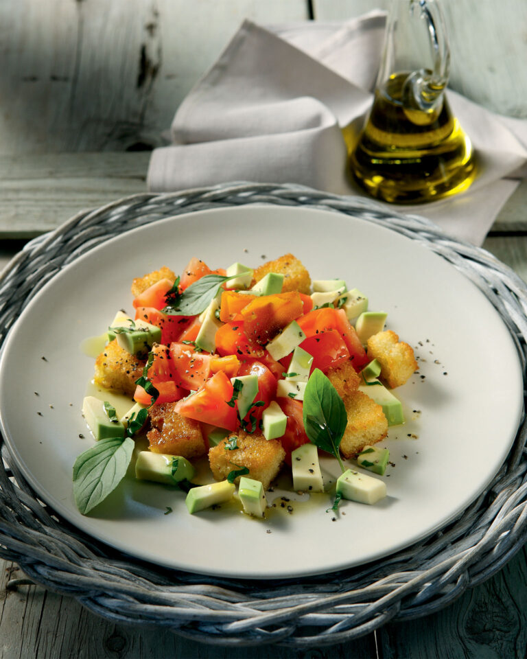 Ντομάτα, αβοκάντο, σκορδάτα σπιτικά κρουτόν και φετούλες αυγοτάραχου σε μια δροσερή σαλάτα με μια μικρή έκρηξη θάλασσας στο στόμα, που αξίζει να δοκιμάσετε.