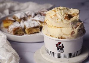 Το βράδυ θα πετύχετε και το vacherin, με τυρί κρέμα και αμύγδαλο φιλέ, το οποίο το συνοδεύουν με φρουτοσαλάτα
