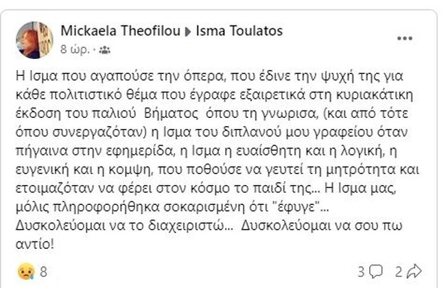 Θρήνος στον δημοσιογραφικό κόσμο, από τον ξαφνικό χαμό της πολιτιστικής συντάκτριας Ισμας Τουλάτου, η οποία έφυγε από τη ζωή ξαφνικά, ενώ σε λίγες ημέρες θα έφερνε στον κόσμο το πρώτο της παιδί.