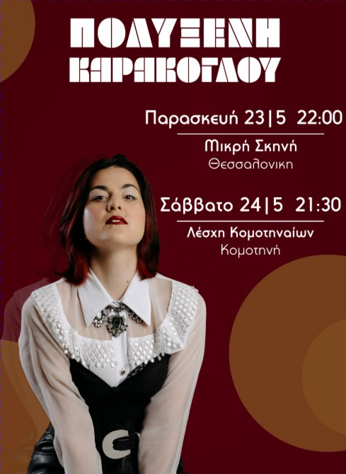 Με αφορμή την κυκλοφορία του νέου της τραγουδιού με τίτλο «Του Κόσμου η Ρότα» η τραγουδοποιός – τραγουδίστρια Πολυξένη Καράκογλου, συνεχίζει το acoustic tour σε όλη την Ελλάδα, παρέα με δύο υπέροχους συνταξιδιώτες. Τον Περικλή Μαλακατέ στην κιθάρα και το μπάσο και τον Ντίνο Χατζηιορδάνου στο ακορντεόν και στο πιάνο.Την Παρασκευή 23 Μαΐου θα βρίσκεται στην Μικρή Σκηνή στη Θεσσαλονίκη και το Σάββατο 24 Μαΐου στη Λέσχη Κομοτηναίων στην Κομοτηνή.