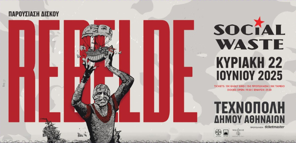 Οι Social Waste επιστρέφουν στην Τεχνόπολη με πολυαναμενόμενο καινούριο δίσκο! 5 χρόνια μετά την τελευταία τους δισκογραφική δουλειά, οι Social Waste επιστρέφουν δυναμικά στην Τεχνόπολη, την Κυριακή 22 Ιουνίου, αυτή τη φορά έχοντας μαζί τους και τα τραγούδια του καινούργιου τους δίσκου Rebelde!