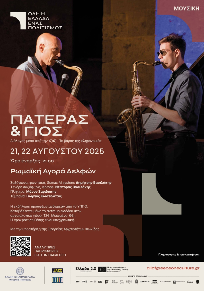 Ο διεθνούς φήμης σαξοφωνίστας, συνθέτης και εκπαιδευτικός ερευνητής Δημήτρης Βασιλάκης, μαζί με τον ταλαντούχο μουσικό και γιο του Νέστορα Βασιλάκη, παρουσιάζουν μια μοναδική μουσική εμπειρία στη Ρωμαϊκή Αγορά των Δελφών, στις 21 και 22 Αυγούστου 2025, στις 21:00.