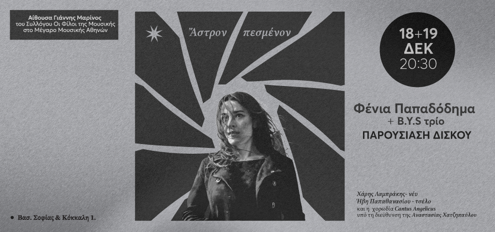 Η Φένια Παπαδόδημα παρουσιάζει το νέο της άλμπουμ «Άστρον πεσμένον» με τραγούδια που έγραψε τα τελευταία χρόνια κάτω από την επήρεια «της μαγείας του Αλέξανδρου Παπαδιαμάντη» και τα οποία παίχτηκαν και ηχογραφήθηκαν μαζί με το B.Y.S trio των Χ. Μπουκάλη. Κ. Γιαξόγλου και Ν. Σιδηροκαστρίτη.