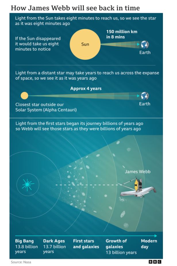 Το κόστους 10 δισεκατομμυρίων δολαρίων τηλεσκόπιο θα τεθεί σε τροχιά γύρω από τον Ήλιο στο δεύτερο σημείο Lagrange ή L2, μένοντας σε περίπου σταθερή απόσταση 1,5 εκατομμυρίων χιλιομέτρων από τη Γη ή περίπου τέσσερις φορές πιο μακριά από τη Σελήνη. Συγκριτικά, το διαστημικό τηλεσκόπιο Hubble – που είχε εκτοξευθεί το 1990 – βρίσκεται στο ένα τρίτο αυτής της απόστασης από τον πλανήτη μας (σχεδόν 550 χιλιόμετρα).