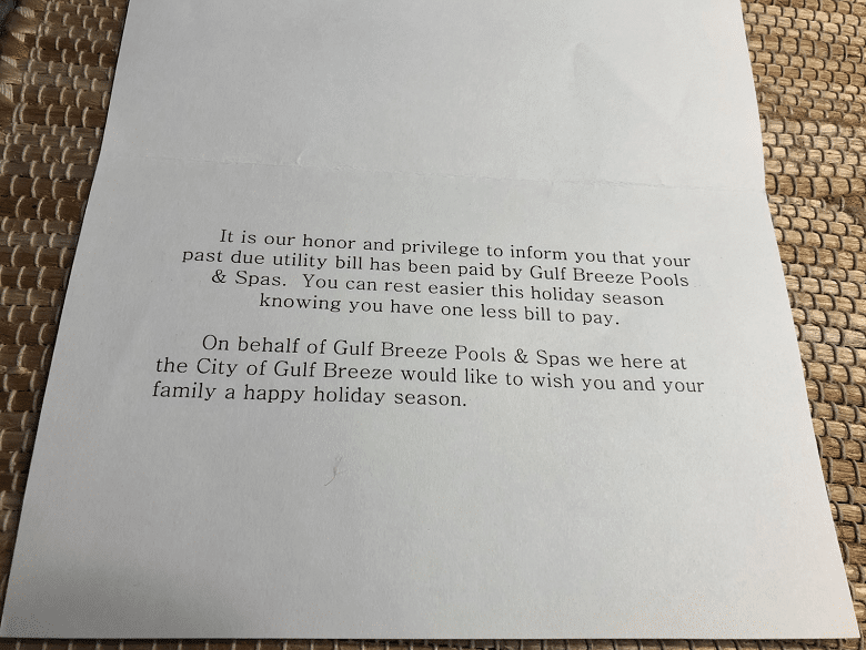 Αυτή η πολύ ανθρώπινη κίνηση ξεκίνησε όταν ο 73χρονος Μάικλ Έσμοντ έλαβε τον δικό του λογαριασμό ρεύματος. Θέλησε μετά, να απαλλάξει ανθρώπους που το χρειάζονται από έναν λογαριασμό ρεύματος ενόψει της εορταστικής περιόδου. Επικοινώνησε λοιπόν, με το Gulf Breeze, όπου και διαμένει, και ζήτησε να βοηθήσει όλους όσους είχαν απλήρωτο λογαριασμό.