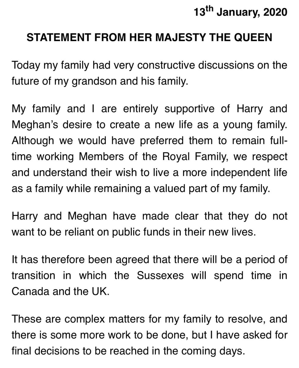 «Ο Χάρι και ο Μέγκαν έχουν καταστήσει σαφές ότι δεν θέλουν να εξαρτώνται από δημόσιους πόρους στη νέα τους ζωή. Έχει επομένως συμφωνηθεί ότι θα υπάρξει μια περίοδος μετάβασης στην οποία τα Sussexes θα περάσουν χρόνο στον Καναδά και στο Ηνωμένο Βασίλειο. Πρόκειται για πολύπλοκα ζητήματα που πρέπει να επιλύσει η οικογένειά μου και πρέπει να γίνουν ακόμη περισσότερα, αλλά ζήτησα να ληφθούν οριστικές αποφάσεις τις προσεχείς ημέρες», κατέληξε η βασίλισσα Ελισάβετ.