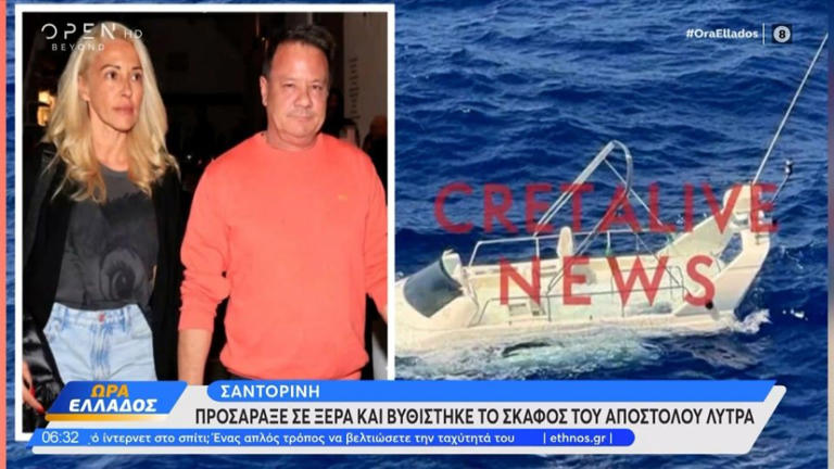 Σε ξέρα κοντά στη Σαντορίνη προσάραξε και στη συνέχεια βυθίστηκε σκάφος, το οποίο ανήκει στον γνωστό ποινικολόγο Απόστολο Λύτρα. Μαζί του επέβαινε η σύζυγός του, Θεοδώρα Παπαδοπούλου.