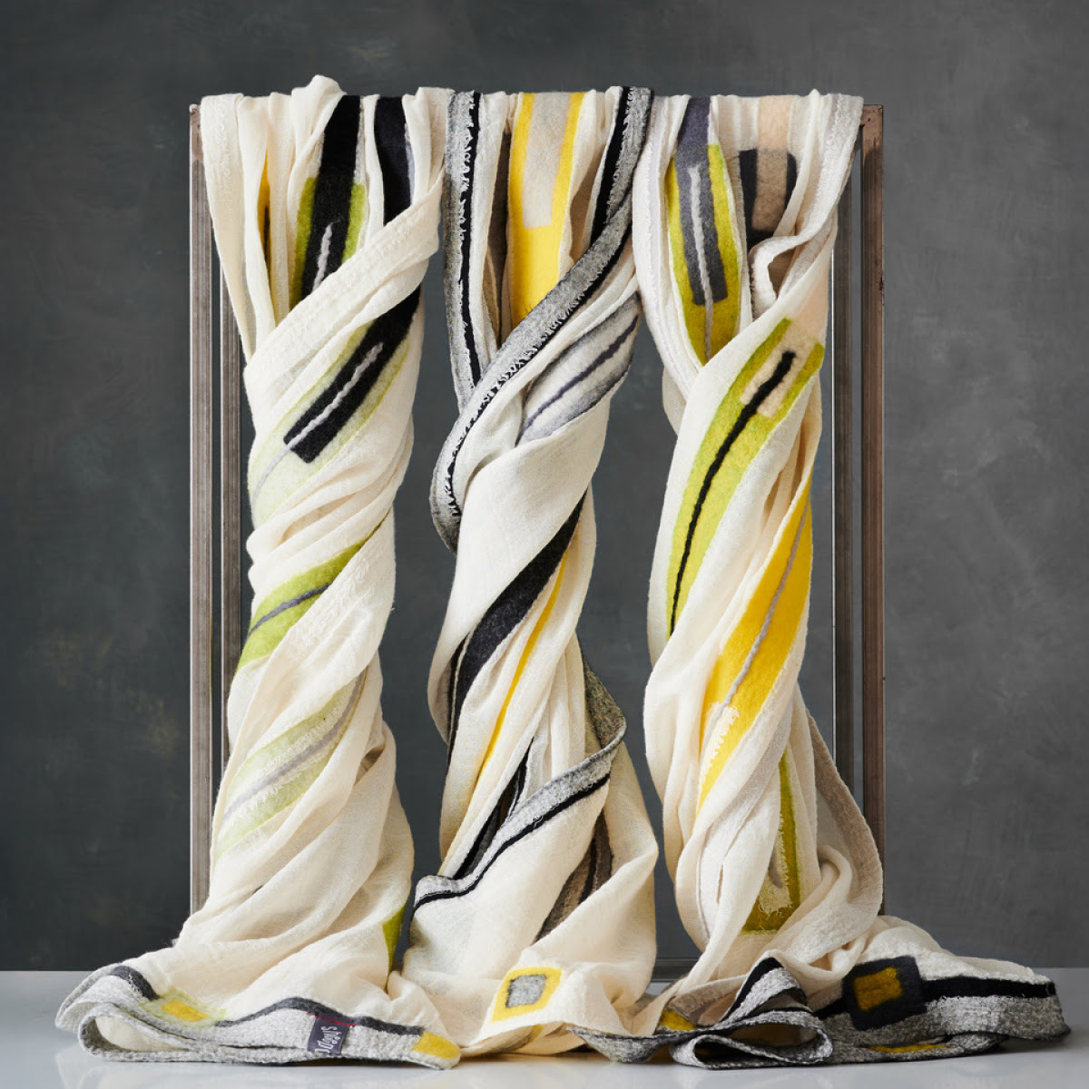Η βιτρίνα της Κριεζώτου γίνεται ένας τόπος υλικής μεταμόρφωσης. Μαλλί και ύφασμα, σε μια σιωπηλή διεργασία αλλαγής μέσω της τεχνικής του nuno felting, συναντιούνται, διαπλέκονται και αναγεννιούνται σε νέα σώματα ύφανσης. Μοναδικά αξεσουάρ και διακοσμητικά είδη ισορροπούν ανάμεσα στο εικαστικό έργο και το χρηστικό αντικείμενο.