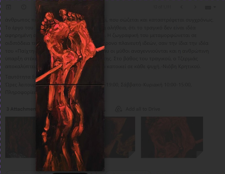 Στο επίκεντρο των εκθεμάτων βρίσκεται ο Οιδίποδας, μια μορφή αρχέτυπο της ανθρώπινης τραγωδίας, την οποία ο καλλιτέχνης επανεγγράφει μέσα από μια εσωτερική, προσωπική μα και πανανθρώπινη οπτική. Στη ζωγραφική του Τζερμιά, το φως δεν σώζει αλλά καίει, το αίμα, η στάχτη και το χρυσό μετατρέπονται σε σύμβολα γνώσης και ύβρεως. Ο θεατής δεν παρακολουθεί την τραγωδία ως αναπαράσταση αλλά τη βιώνει ως εσωτερικό γεγονός, σε έναν κόσμο όπου η αλήθεια πληρώνεται με το ίδιο το φως των ματιών.Λίγο αργότερα, το ταξίδι συνεχίζεται στο Κέντρο Τεχνών Μετς με την έκθεση «Το δαχτυλίδι στον βάλτο με τα νούφαρα», που εγκαινιάζεται στις 20 Νοεμβρίου 2025.