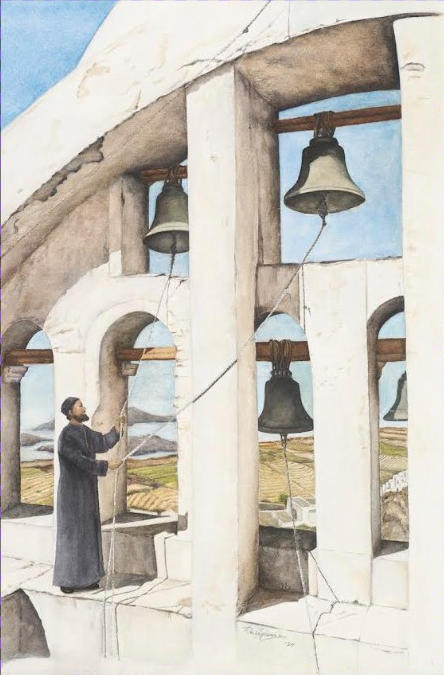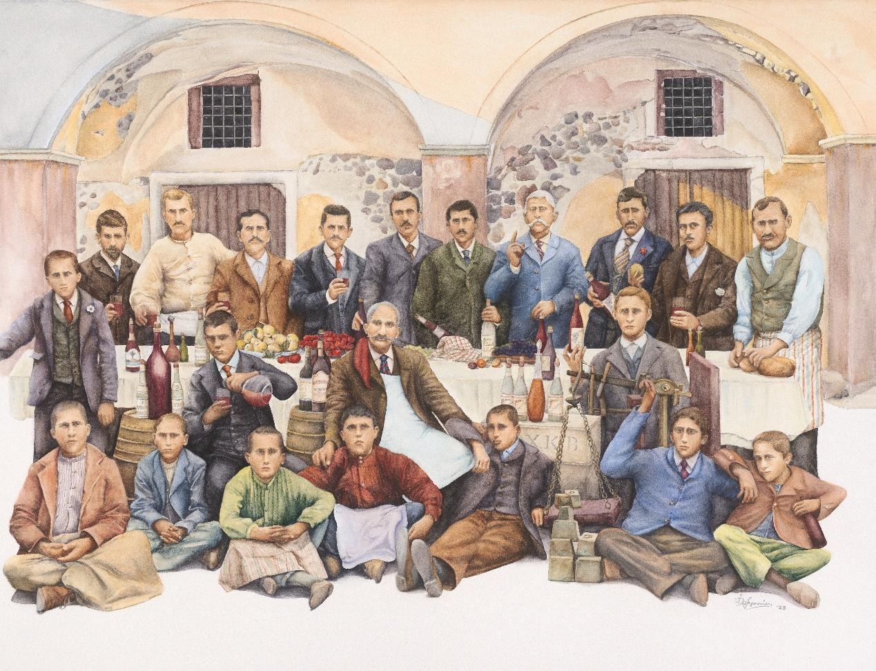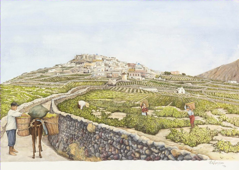 Ορίζοντας ένα νέο βλέμμα στις αθέατες αλλά ενεργές πολιτισμικές καταβολές της Σαντορίνης, η Άρτεμις Χατζηγιαννάκη παρουσιάζει δέκα πέντε νέα έργα (όλα υδατογραφίες) αρμολογημένα σε ένα ιστορικό αφήγημα μέσα από τους τελετουργικούς κύκλους της παράδοσης, των κύκλων εργασίας, της τοπικής οικονομίας, των εθίμων και του συλλογικού θυμικού. Ο επισκέπτης θα αναγνωρίσει πτυχές μιας Σαντορίνης που επιβιώνει όχι μόνο στη μνήμη και στην προφορική μαρτυρία, αλλά και στο ανάγλυφο του τοπίου, στην αρχαία γη, στην γραμμή του ορίζοντα, στην παράδοση της αμπέλου και του οίνου, στα γεωργικά προϊόντα, στη χλωρίδα και στους κύκλους του χρόνου, στην αρχιτεκτονική, που διατρέχει τη στερεότυπη εικόνα της Σαντορίνης μέσα από εκλάμψεις αυθεντικότητας και αρχέγονης σοφίας. Στην έκθεση παρουσιάζονται επίσης και τέσσερα παλαιότερα έργα της εικαστικού με θεματική συνάφεια, εμπνευσμένα από τις τοιχογραφίες του Προϊστορικού Οικισμού του Ακρωτηρίου, που υποδηλώνουν την αρχέγονη εξάρτηση του ανθρώπου από τα στοιχεία της φύσης και τους τελετουργικούς κύκλους της (σκηνές του φυτικού και ζωικού βασιλείου με θαλασσόκρινους, κυανοπιθήκους, αντιλόπες).