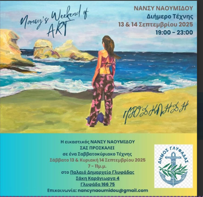 Σε ένα διήμερο Τέχνης μας προσκαλεί η αξιόλογη εικαστικός Νάνσυ Ναουμίδου, στο Παλαιό Δημαρχείο Γλυφάδας (Σάκη Καράγιωργα 4) όπου θα παρουσιάσει τη νέα της ατομική έκθεση ζωγραφικής μέσα από την οποία έχει σκοπό να μας ταξιδέψει στις δικές της θάλασσες.