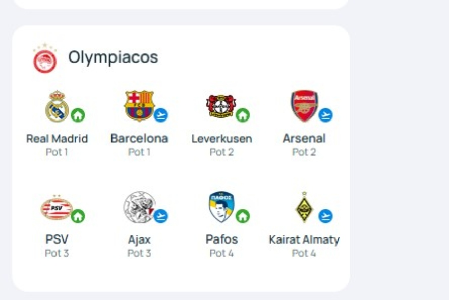 Ο Ολυμπιακός στις 2 πρώτες αγωνιστικές θα βρει μπροστά του τη Ρεάλ Μαδρίτης εντός έδρας και τη Μπαρτσελόνα εντός. Ακολουθούν οι Λεβερκούζεν στο Καραϊσκάκη, η Άρσεναλ εκτός, η PSV Αϊντχόφεν εντός, ο Άγιαξ στην Ολλανδία και μετά η Πάφος εντός και η Καϊράτ εκτός. Το πρόγραμμα θα γίνει γνωστό το Σάββατο.