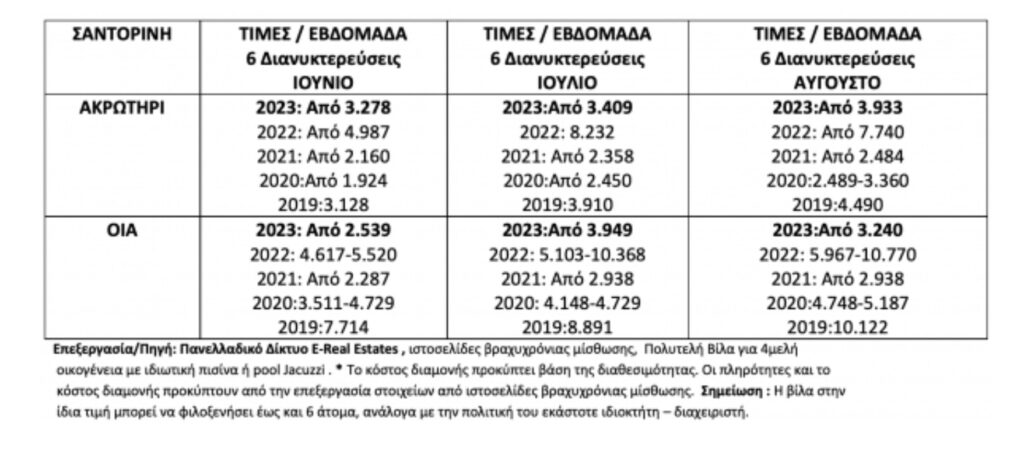 Το κόστος μίσθωσης για 6 διανυκτερεύσεις τον Ιούνιο στο Ακρωτήρι της Σαντορίνης για κατοικία 149τμ με 3 Υ/Δ ξεκινά από 3.287€ συνολικά, τον Ιούλιο αγγίζει τις 3.409€ για κατοικία 120τμ με 3Υ/Δ και τον Αύγουστο από 3.933€ για κατοικία 190τμ με 3Υ/Δ.