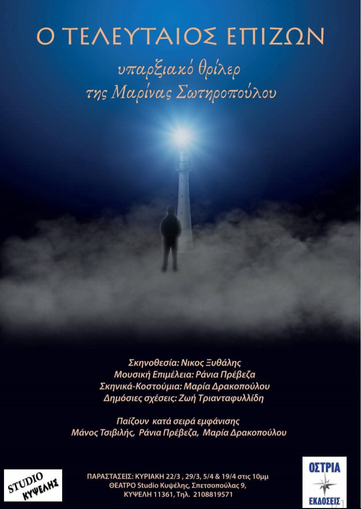 ● 4ος ΚΥΚΛΟΣ ΠΑΡΑΣΤΑΣΕΩΝ, ΚΥΡ 22.00 μ.μ. ” Ο τελευταίος Επιζών “υπαρξιακό θρίλερ της Μαρίνας Σωτηροπούλου σε σκηνοθεσία Νίκου Ξυθάλη, στο Studio Κυψελης StudioKypselis Polychoros Studiokypselis.gr.