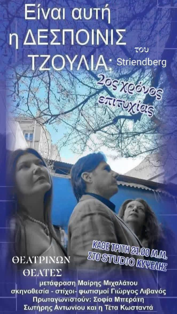 ●Την ΤΡΙΤΗ 31-3 μια σημαντική παράσταση για τους Θεατρίνων Θεατές ολοκληρώνει την τρίτη της παράταση για το δεύτερο χρόνο! ΕΙΝΑΙ ΑΥΤΗ Η ΔΕΣΠΟΙΝΙΣ ΤΖΟΥΛΙΑ; του Striendberg.