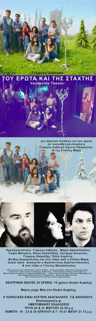 ● Τρίτη 31/3 22.30 μ.μ. και μετά το Πάσχα Πέμπτες 21.00 μ.μ. Γιώργου Λιβανού ΤΟΥ ΕΡΩΤΑ ΚΑΙ ΤΗΣ ΣΤΑΧΤΗΣ Vaudeville Τheater μια σκηνική σύνθεση για τον έρωτα σε σκηνοθετική επιμέλεια Γιώργου Λιβανού, Σίμωνα Πάτροκλου & της Στέλλας Μαρή Θεατρίνων