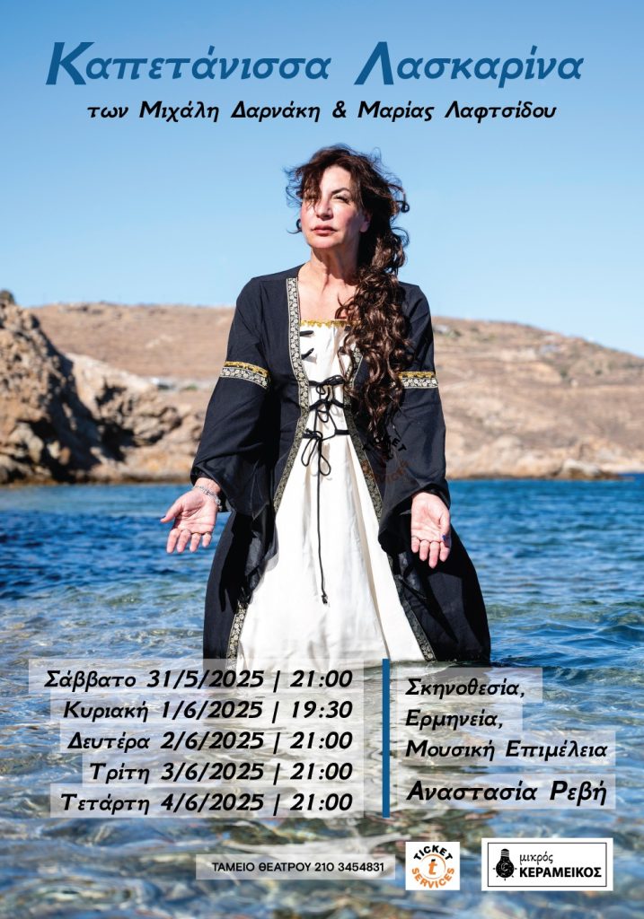 Η Εταιρεία Παραγωγής Theatre Lab Company, με έδρα το Λονδίνο, παρουσιάζει το θεατρικό έργο “Καπετάνισσα Λασκαρίνα” σε κείμενο των Μιχάλη Δαρνάκη και Μαρίας Λαφτσίδου και σε σκηνοθεσία και ερμηνεία της Αναστασίας Ρεβή στο Θέατρο Μικρός Κεραμεικός από τις 31 Μάϊου έως τις 4 Ιουνίου, για 5 μόνο παραστάσεις.