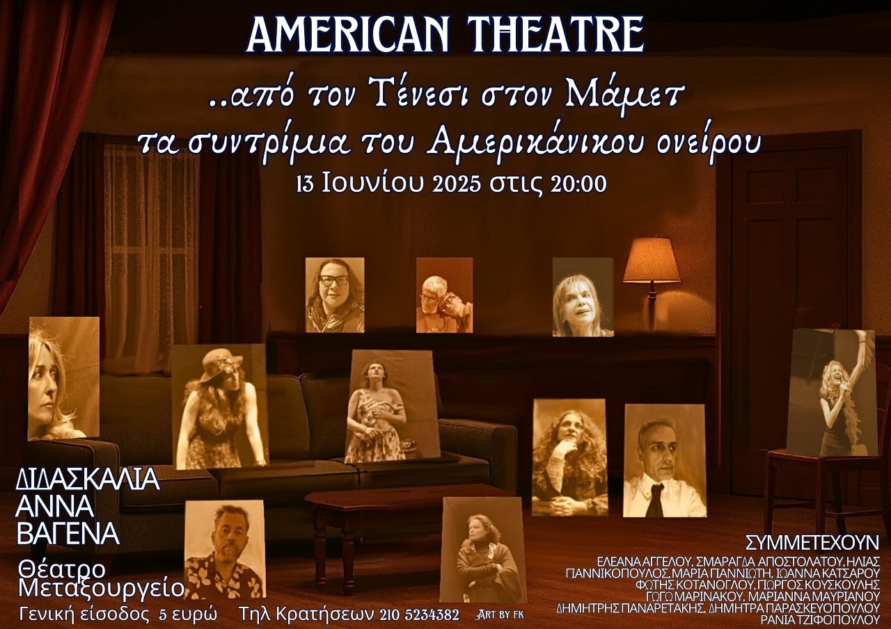 Την Παρασκευή 13 Ιουνίου στις 21:00, θα δοθεί στο θέατρο Μεταξουργείο παράσταση με τίτλο τα συντρίμμια του αμερικανικού ονείρου σε κείμενα των Τενεσί Ουίλιαμς, Έντουαρντ Άλμπι και Ντέιβιντ Μάμετ.